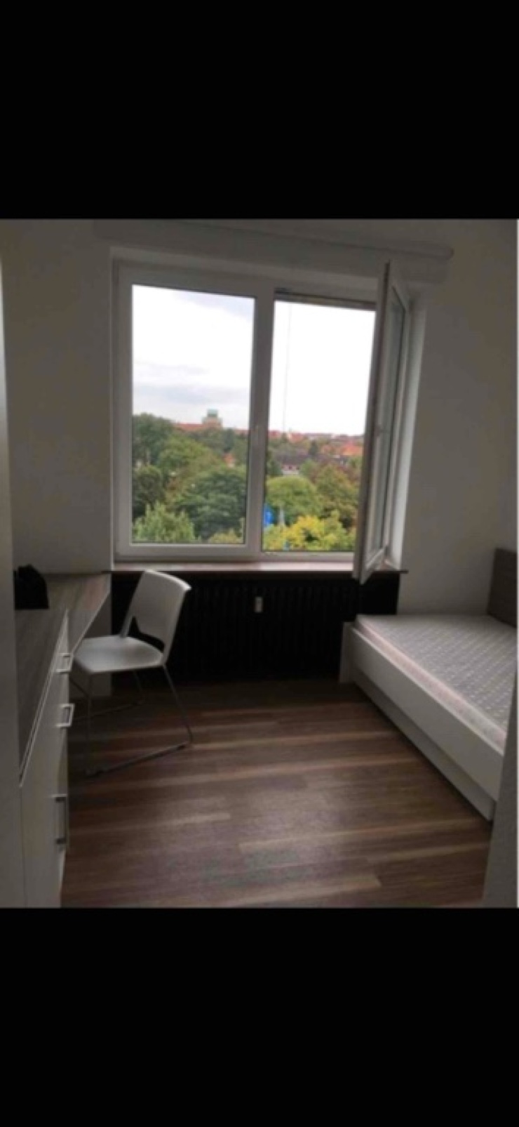 Das Zimmer ist komplett möbliert, so kannst du ohne Probleme direkt einziehen. Es ist alles da, was du brauchst: Bett, Schreibtisch, Spiegel und Schrankwand mit großem Schrank und einer Ablagefläche, auf der ein Toaster etc Platz findet.