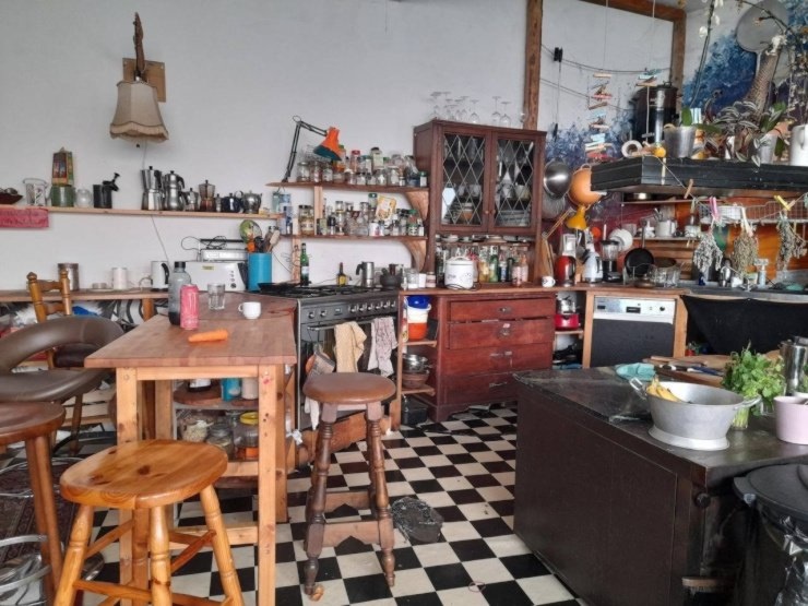 Das Haus ist groß und alt. Das bietet einerseits viel Platz und Möglichkeiten sich auszuleben, wir haben zum Beispiel eine Werkstatt im Keller und viel Stauraum. Andererseits bedeutet es auch eine Menge Improvisation und Reparatur. Das Haus ist zweigeschössig mit Treppe und allein deshalb leider nicht rollstuhlgerecht. Und für starke Allergiker*innen oder Personen mit Atemwegserkrankungen ist das Haus vermutlich auch nicht so gut geeignet.