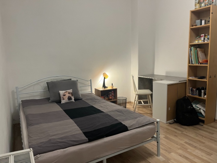 Das Zimmer ist ca. 17 m2 groß und liegt direkt neben dem Balkon sowie der Küche/dem Wohnzimmer. Dadurch ist es sehr angenehm, kurz frische Luft zu schnappen, sich schnell etwas zu essen zu holen oder einfach auf der Couch zu entspannen. Ein großer Vorteil des Zimmers ist, dass es zur Hofseite liegt, sodass kein Straßenlärm stört.