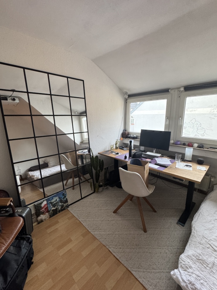 My room is 14sqm, in a relaxed 2s WG and through the attic apartment and wide windows the room is relatively bright.