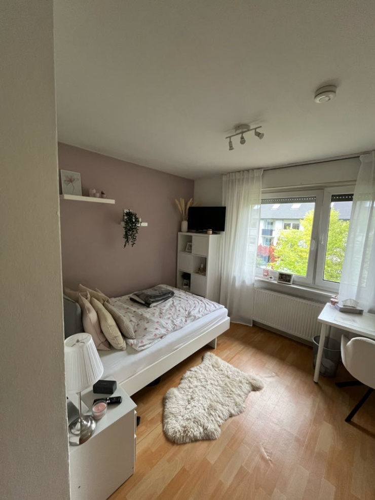 Das Zimmer ist 12 qm groß. Das Bett inkl. Lattenrost und Matratze, der Kleiderschrank, die Gardinen und die Wandregale bleiben während deiner Zeit in der WG im Zimmer stehen, sodass du sie nutzen kannst.