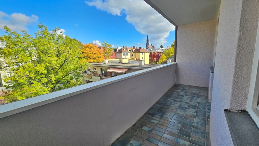 Balkon: Groß, mit Ausrichtung zum ruhigen Innenhof und Blick auf die ikonische Heilig-Kreuz-Kirche in Giesing.