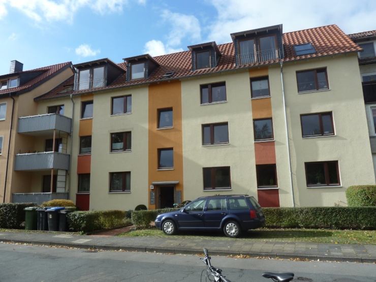 El apartamento 3-Zi en la planta baja de una casa multifamiliar consta de un salón y dormitorio, balcón y cocina. El baño con bandeja de ducha y ventana.