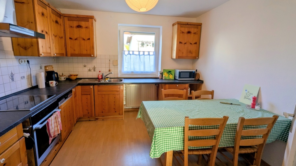 Die Wohnung liegt im Hochparterre und besteht aus drei Zimmern, Küche, Bad und Flur. Dein Zimmer ist gut geschnitten und hat zwei große Fenster, die nach Süden und Westen zeigen.