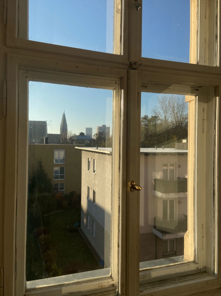 Das Zimmer ist recht schmal aber durch die großen Altbaufenster kommt oft die Sonne rein, was eine helle Atmosphäre kreiert.