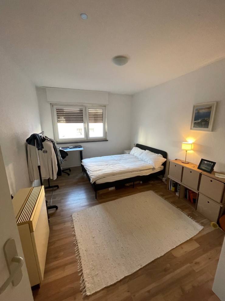 Das Zimmer ist mit einem Schreibtisch, einem Stuhl, einem Doppelbett und einem Kleiderschrank ausgestattet.