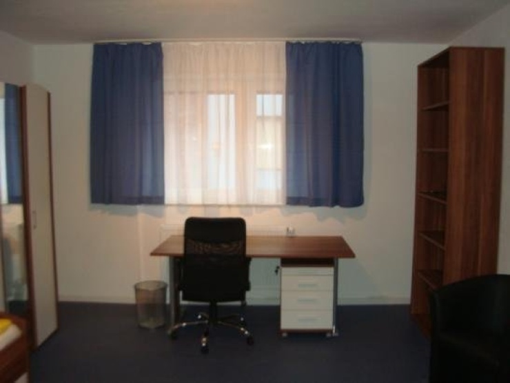 Es ist komplett eingerichtet, hat ein neues Bett, Bettkasten, Kleiderschrank, Schreibtisch, Stuhl, Papierkorb, Bücher/Ordner-Regal, Licht, Bettwäsche, Sessel mit Tisch.