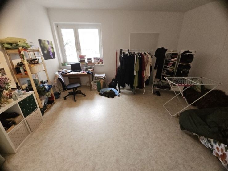 Das Zimmer ist unmöbliert, es ist rechteckig, hat Linoleum Boden und ist gut isoliert, sodass ich sogar im Winter meistens nichtmal die Heizung anmachen musste. Es hat schöne hohe Decken (die Diskokugel nehme ich beim Ausziehen aber leider mit haha).
