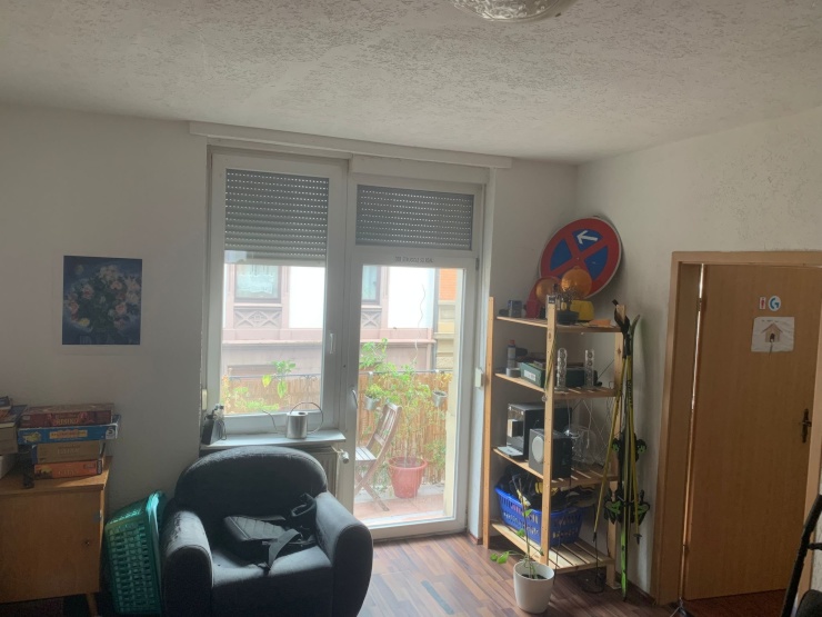 Ein Zimmer ist ein Durchgangszimmer und wird aktuell als gemütlicher Gemeinschafts-/Aufenthaltsraum genutzt – von dort gelangt man direkt auf den Balkon. Perfekt für gemeinsames Essen oder entspannte WG-Abende.